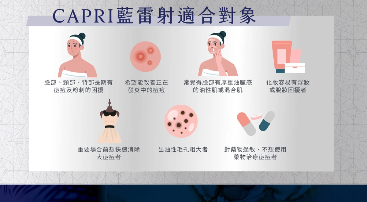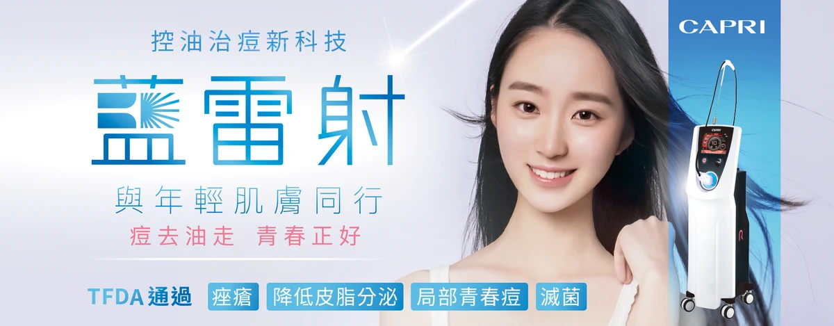 以1450nm波長精準針對皮脂腺根源,減少皮膚的皮脂分泌;搭配450nm波長針對痘痘肌膚消毒殺菌。有效縮短治療時間、穩定肌膚。Capri藍雷射為TFDA台灣衛福部許可,可用於治療局部青春痘、治療痤瘡、滅菌殺菌、降低皮脂分泌。
