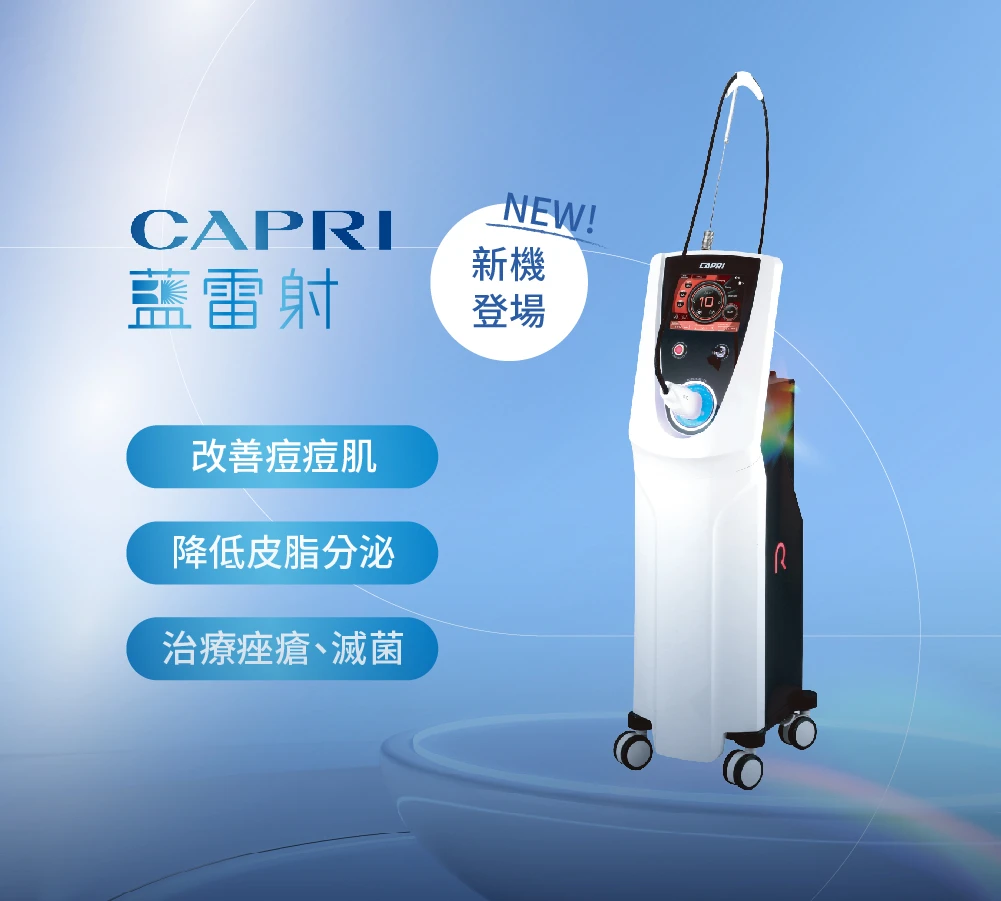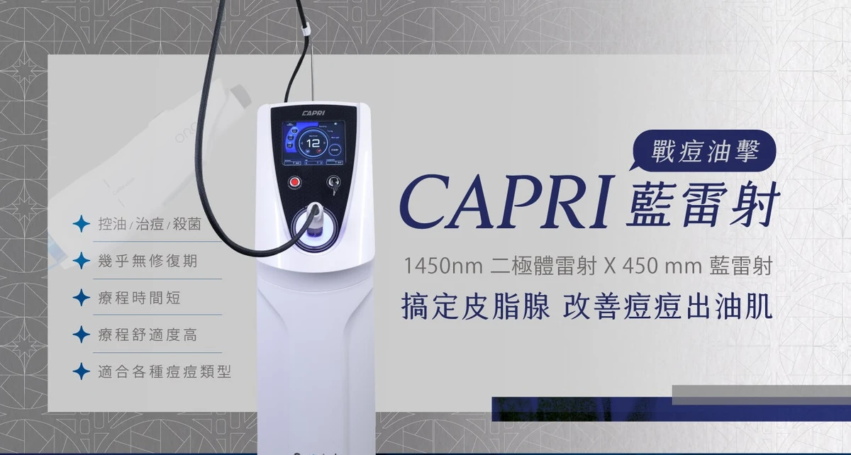 Capri藍雷射(衛福部核准名稱:“Capri” Semiconductor Laser Surgery Machine ”凱沛芮“半導體雷射設備),是針對青春痘及皮脂腺問題治療的雷射儀器,以雙波長1450nm+450nm 能控油、治痘、殺菌滅菌,達到改善「各種類型痘痘」與「過度出油」的肌膚問題。
