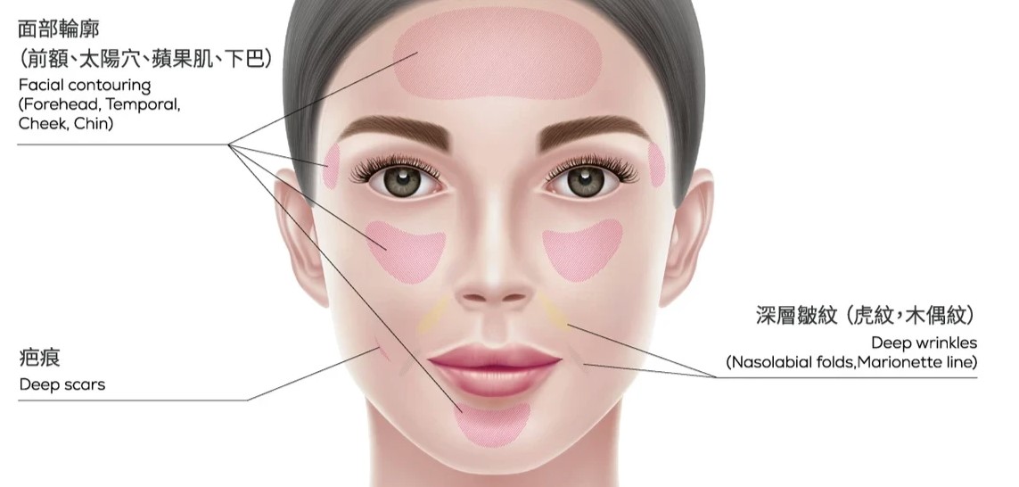 細紋,頸紋,凹陷痘疤,凹陷外傷疤痕,妊娠紋,生長紋,也可以做全臉水光注射,全面提升膚質彈性,建議可以定期施打,補充流失的膠原蛋白。