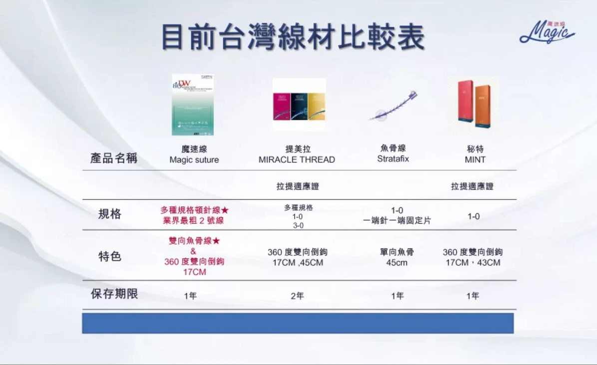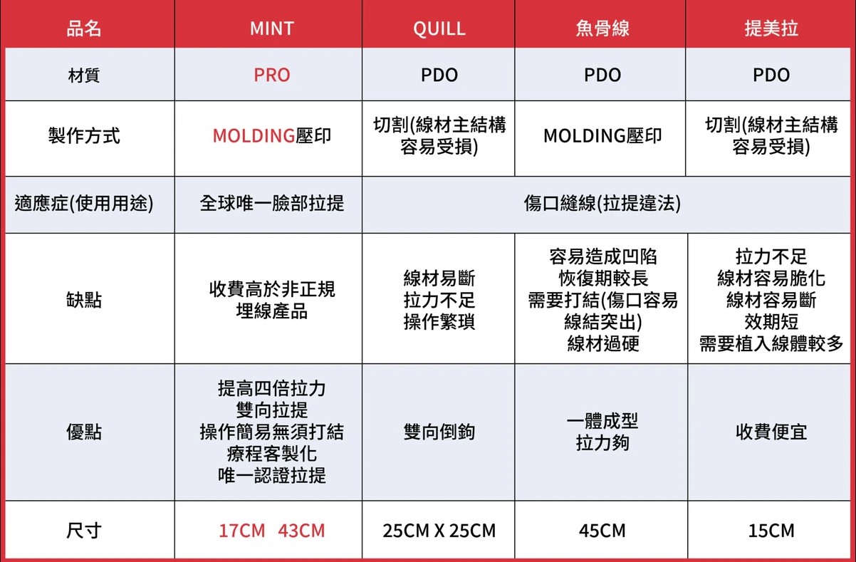利用三種以上,台灣TFDA認證可使用於臉部拉提的線材。