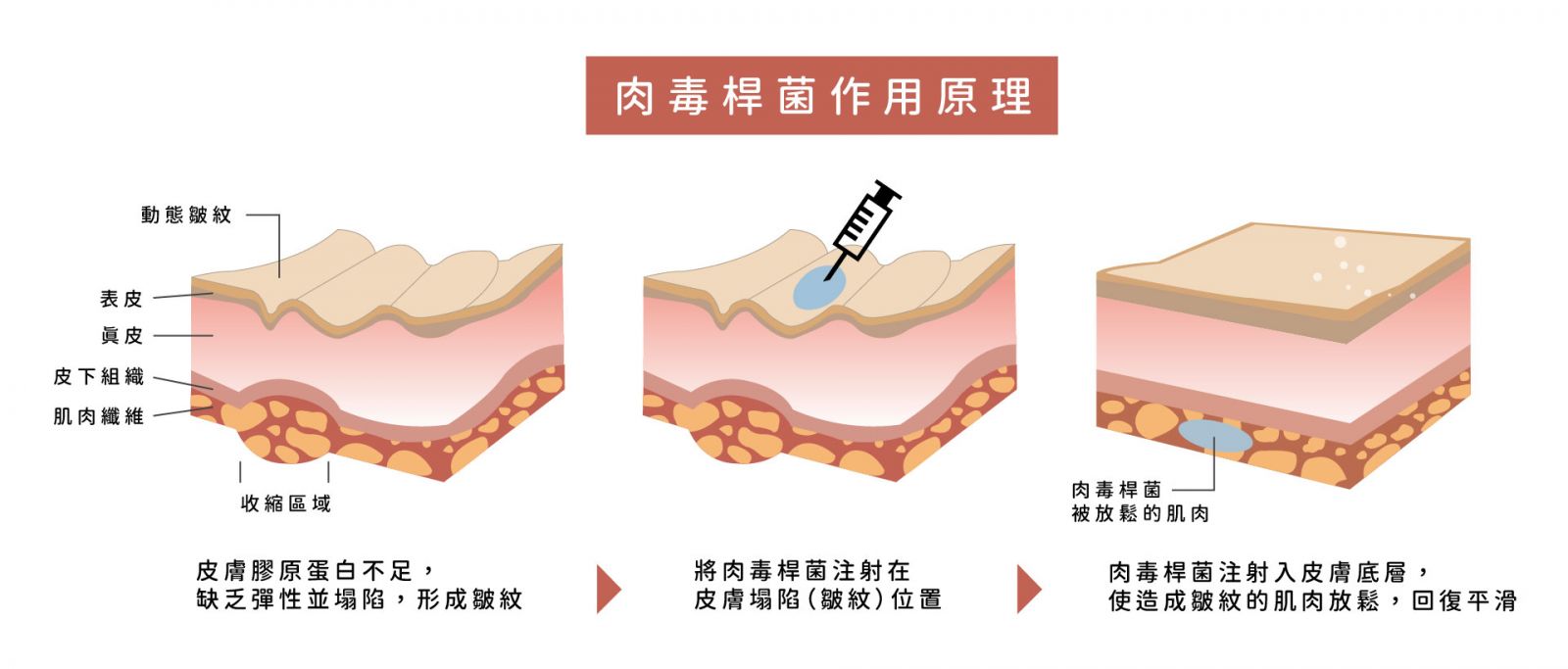 肉毒桿菌素為神經阻斷劑,能抑制乙醯膽鹼釋放,使肌肉暫時無法收縮,達到平滑肌肉與改善紋路的效果。同時也能作用在汗腺,降低汗液分泌。